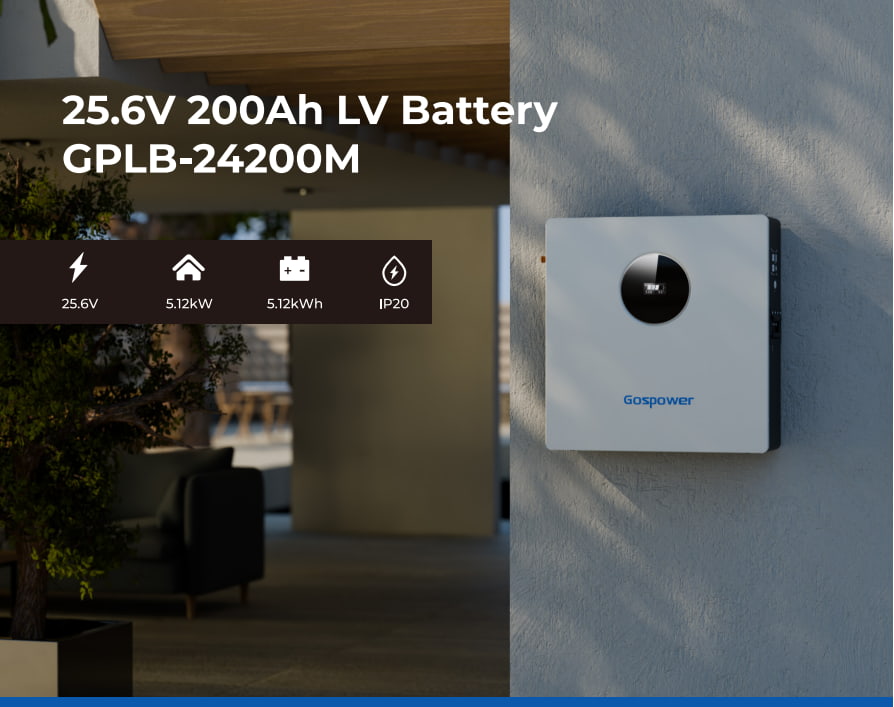 Gospower GPLB-24200M wall mounted lithium battery is engineered with cutting-edge technology, these batteries provide a reliable and efficient energy storage solution for your solar power system. This wall mounted design Li-ion LiFePO4 battery with a total usable energy of 5.12kWh is perfect for small to medium residential or office installations with a proven Lithium Iron Phosphate (LifePO4) solution that offers a low internal resistance with excellent continuous high current discharge performance and great lifecycle of more than 6000 at 80% DOD. The battery has a wide operating temperature range without many restrictions, making it more convenient for daily life and work. The 5.12kwh wall-mounted solar battery supports a parallel connection to expand capacity and power.